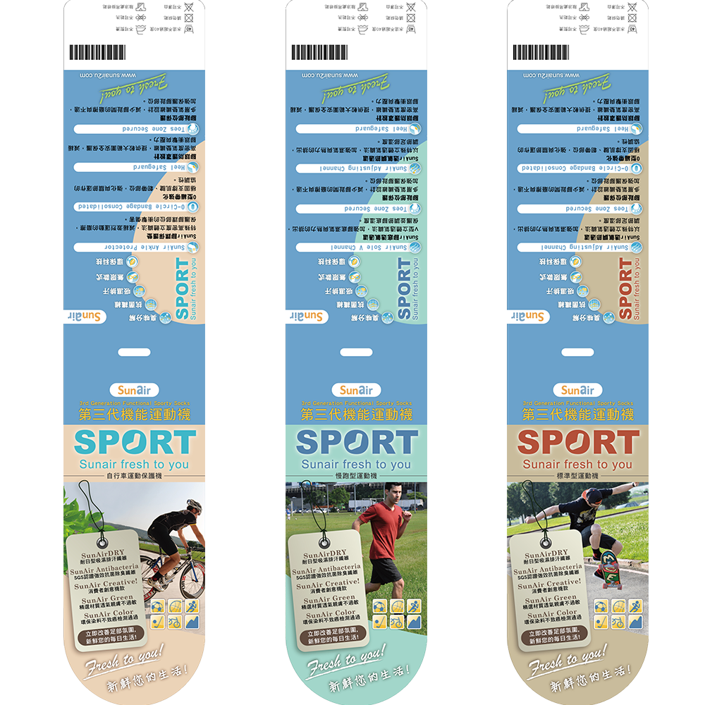 從SPORT字體設計到色彩配置進行系列化規劃,針對三種不同運動情境設計對應的襪款吊卡。透過情境照與機能標示來區分自行車保護襪、慢跑專用襪與一般運動用襪,讓消費者能在陳列中快速辨識與選擇。