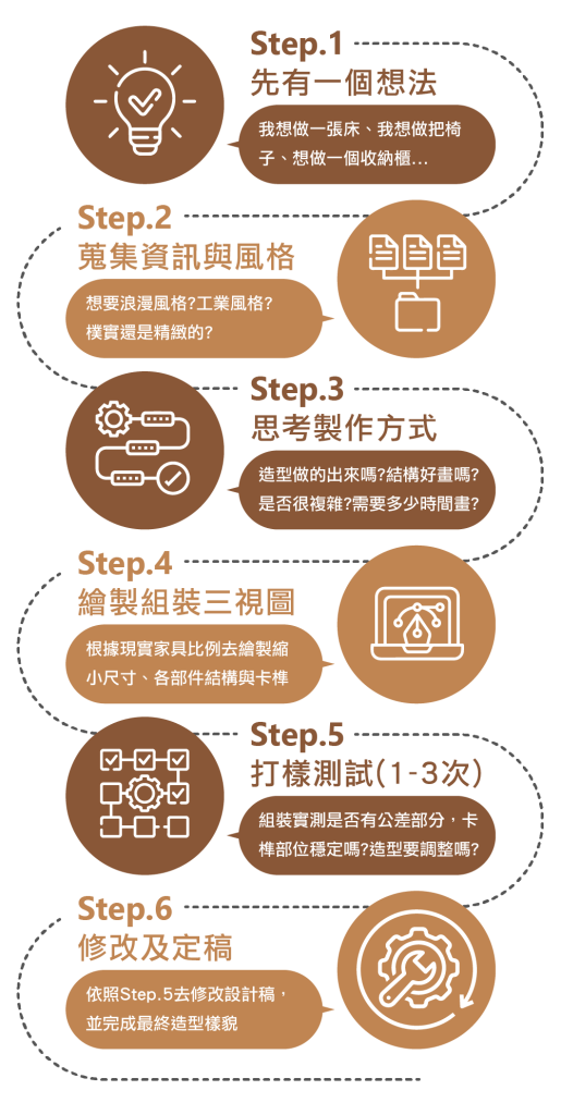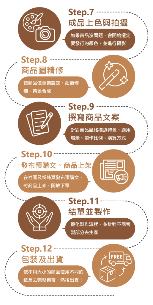 這是我在工作室實際運作的製作流程,包括從概念、製作、打樣、到商品上架與出貨。